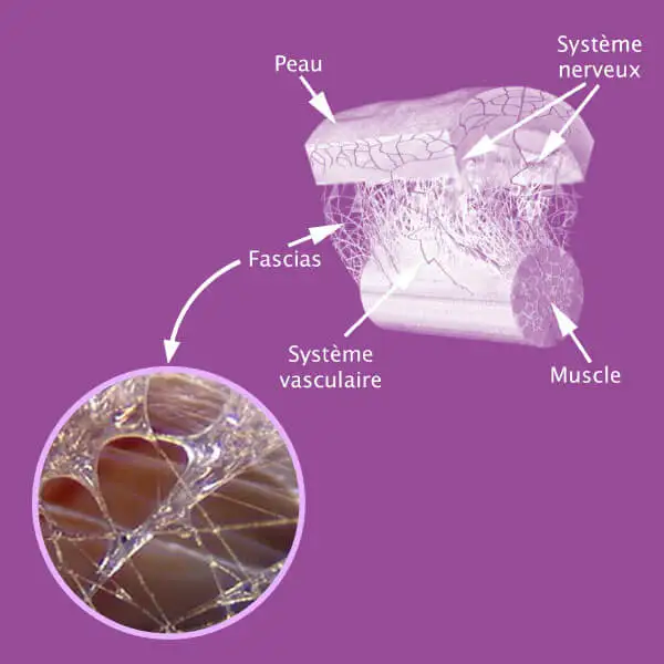 Les fascias sont des membranes fibro-élastiques qui recouvrent et enveloppent toutes les structures anatomiques du corps, sont reliés entre eux et forment un réseau de la superficie à la profondeur.