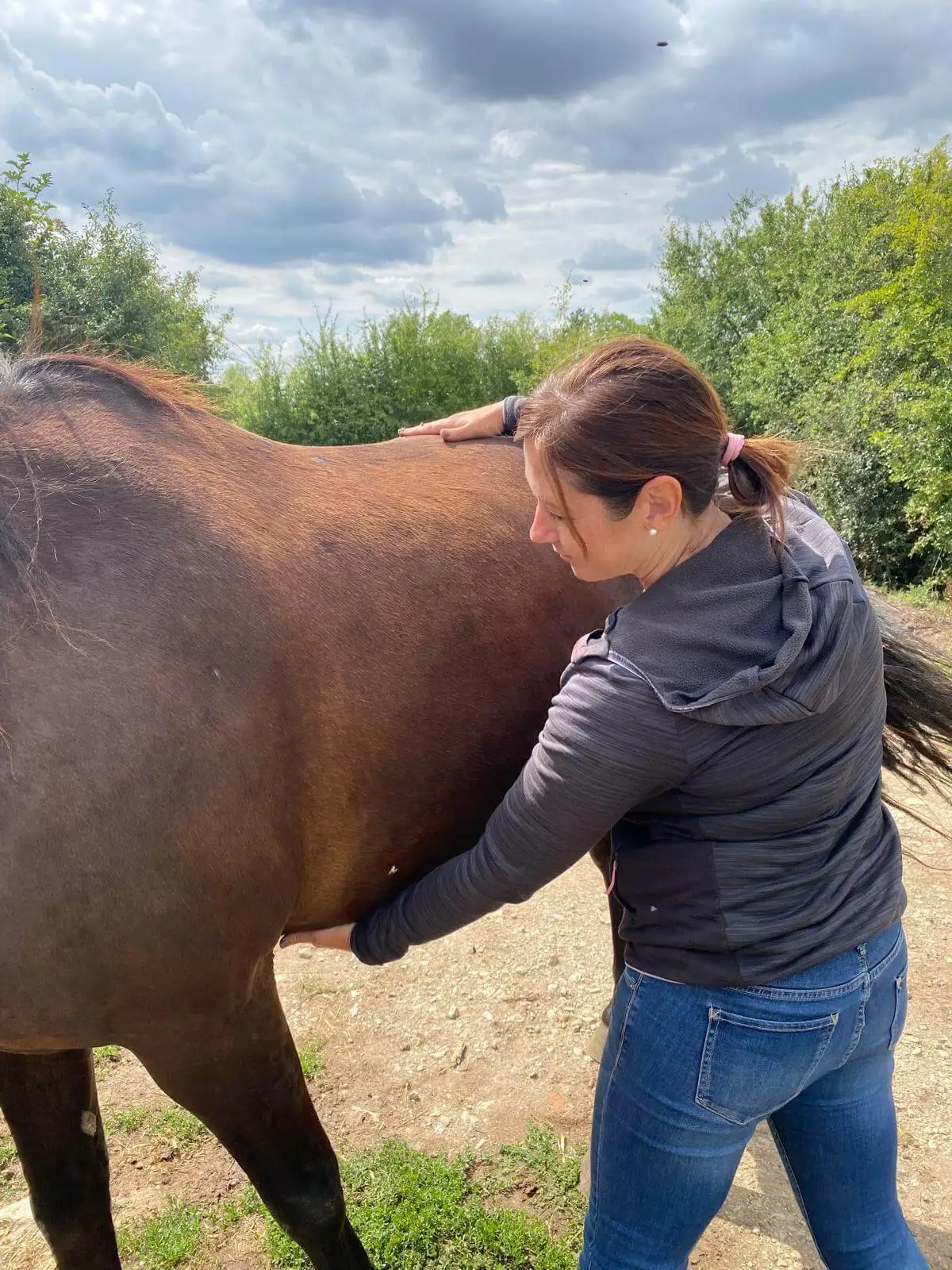Puis un palpatoire pour repérer les zones sensibles, tendues et plus précisément travailler et principalement s’assurer que l’animal est apte à la séance.
